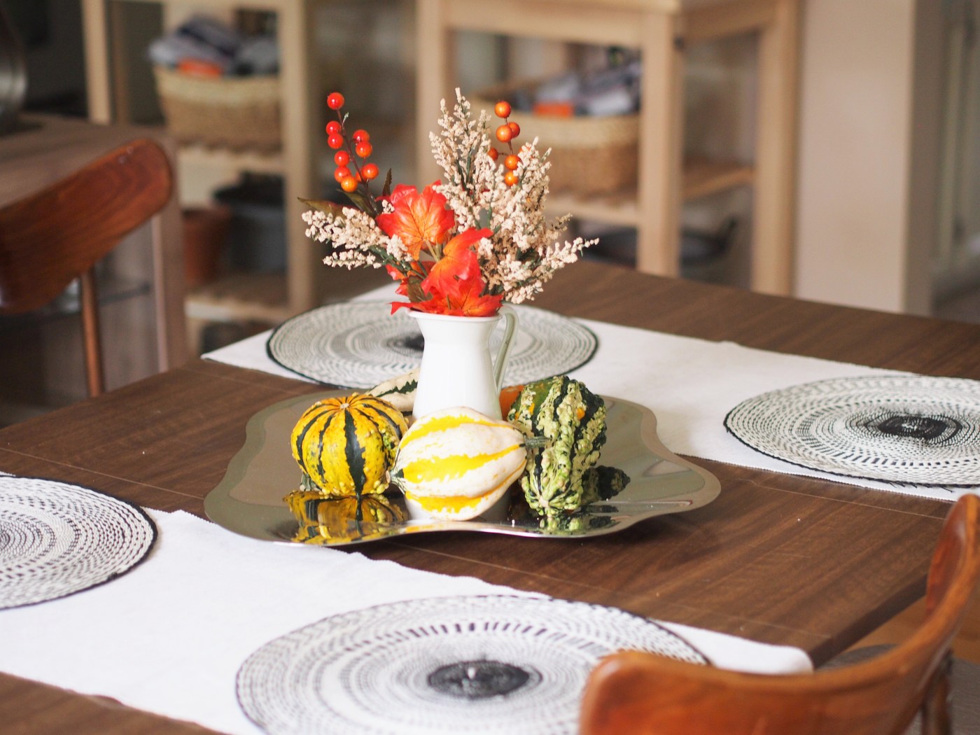 The wreath can be made from harvest plants, fastened with ribbons and adorned with colorful fall leaves, or with dried or fake flowers and foliage. I used materials from a craft store to make my wreath, including a base wreath made from dried twigs. I wanted to invoke the harvest feast though seasonal symbols: trees, Maple leaves, Sun flowers, berries and mini pumpkins.