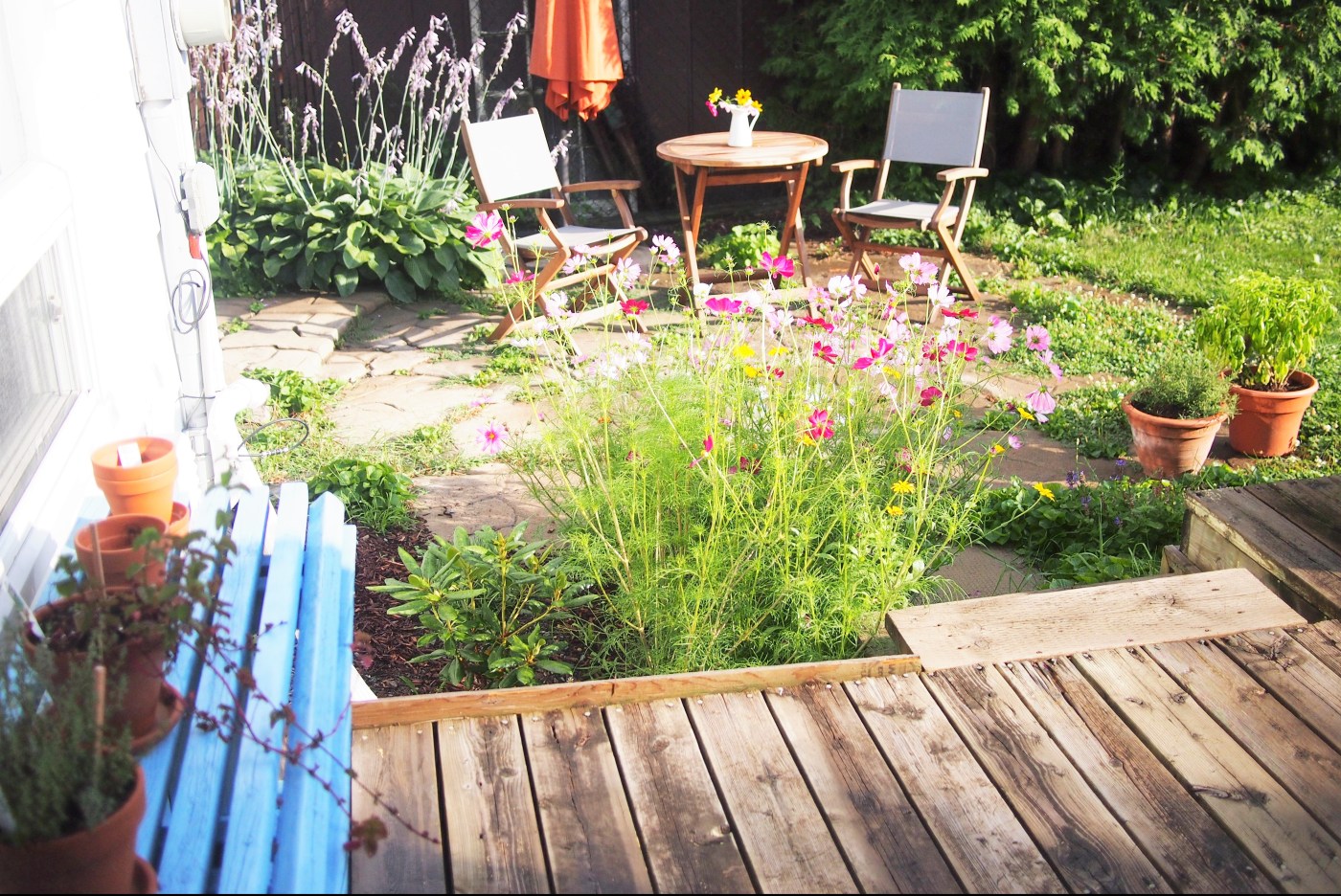 Grounding means to re-connect with the energies of nature: your own nature or the energies of earth. Every morning I bring my coffee and a book outside with the intention to read. But I rarely ever open the book. As soon as I feel the warmth of the sun on my skin, nature overwhelms my senses and I become absorbed by my surroundings. The freshness of the air, the softness of the grass, the buzzing of bees and cicadas, the brilliance of the cosmos flowers dancing in the summer breeze, the towering jungle of sunflowers sparkling in yellow and crimson, the blissful scent of roses….I just sit. Nothing happens. I don’t read, I don’t watch YouTube, I don’t do yoga, I don’t think, I don’t’ try. And I am happy. This is my morning meditation. It is not a carefully planned ritual, it just occurs. I open the door and surrender to nature. The sense of presence acquired through this simple spiritual exercise is unsurpassed by anything I have ever tried before. Of course, meditating in nature does not require a garden. A park, a forest, or even a balcony will do just fine.